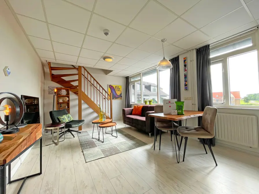 De woonkamer is voorzien van zithoek met LCD tv. Er is een eethoek. De open keuken is ingericht met koelkast, magnetron, koffiezetappartaat, Nespresso en een waterkoker. De badkamer heeft een douche, wastafel en toilet. Op de verdieping is een slaapkamer met 2 eenpersoons boxspringbedden en een extra wastafel. Dit appartement ligt op de 1e etage aan de binnenplaatszijde en heeft geen balkon.
