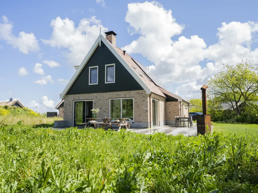 Vanuit de hal kom je door de openslaande industriële deuren in de grote woonkamer. Deze heeft een gezellige zithoek met open haard, ambilight TV, soundbox en een apart eetgedeelte met een robuuste eikenhouten eettafel. De stijlvolle open keuken heeft een kookeiland met bar en is verder ingericht met onder andere inductiekookplaat, magnetron/oven, koelkast, vriezer, vaatwasser, koffiezetapparaat, Nespressomachine, melkschuimer, citruspers en broodrooster. Er is beneden een slaapkamer met een dubbel-boxspringbed (210 cm lang). De aangrenzende badkamer heeft een inloopdouche, wastafel en toilet. Er is een extra toilet en een bijkeuken met wasmachine en droger. Op de bovenverdieping zijn drie slaapkamers, elk met twee boxspringbedden (tweepersoonsbed van 210 cm lang, 2 x 2 enkele bedden van 200 cm lang). Alle slaapkamers zijn voorzien van verduisterende Sunway rolgordijnen en horren. De ruime gezamenlijke badkamer heeft een ligbad, inloopdouche en dubbele wastafel. Er is ook een apart toilet op de bovenverdieping. Buitenduin heeft een riante tuin van meer dan 1000 m2 met groot terras, een speelweide met zandbak, speeltoestel en een wilde bloemen- en duintuin. Er staat een Weltevree buitenkachel (zelf hout meebrengen).