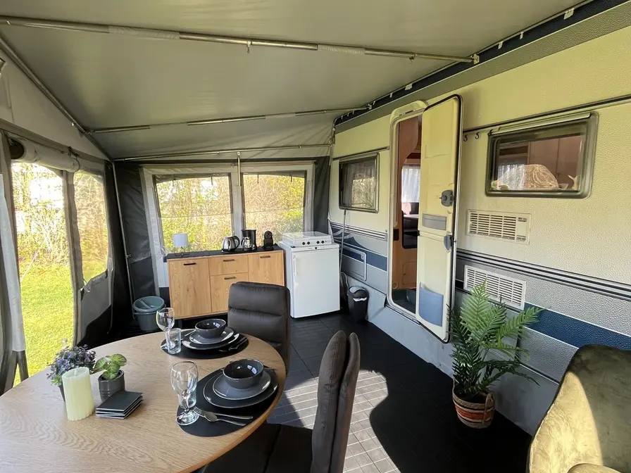 Deze compleet ingerichte toercaravan met voortent is geschikt voor 2 personen en staat op een ruime plaats op onze boerencamping. De inrichting is van alle gemakken voorzien. De caravan heeft een tweepersoons bed en een open keuken. Hier vind je een grote koelkast, een 4 pits kookstel, een Nespresso apparaat, filterkoffie apparaat, waterkoker, oven, tosti apparaat en een prachtig servies. In de voortent kun je in lekkere fauteuils bij de televisie zitten, of genieten aan de eettafel. Het bed is opgemaakt, er ligt een handdoekenpakket en een setje Rituals. Je beschikt over een tuin met tuinmeubels. Er is een toilet in de caravan aanwezig. Je kunt gebruik maken van toilet, wastafel en douche en wasmachine in het gemeenschappelijke toiletgebouw op de camping. Rook en huisdiervrij