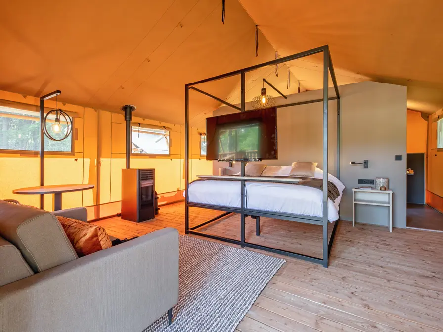 Een ruime luxe ingerichte lodge met een eigentijdse inrichting. Comfortabel dankzij de pelletkachel, regendouche, apart bad en toilet. De open keuken is voorzien van een 2-pits inductie kookplaat, waterkoker, Nespresso apparaat en een koel- vrieskast. De lodge heeft een grote veranda aan de voorzijde en een kleinere aan de achterzijde.