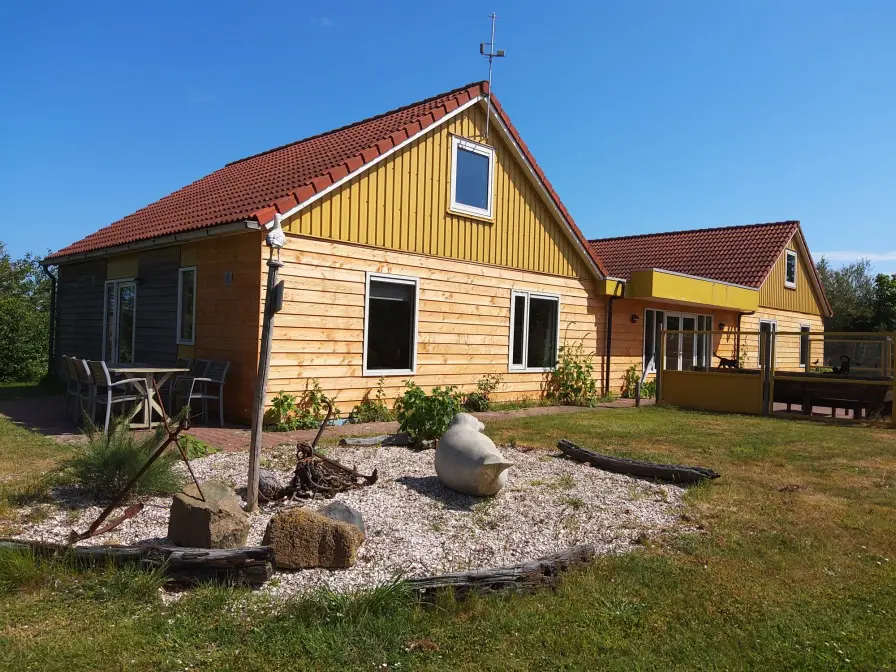 De vakantie woning heeft een privé terras met eigen meubilair, er is rondom een heg aanplant. Het ruime aangelegde parkeerterrein deel je met andere bezoekers, het speelveld en toestellen is ook voor algemeen gebruik.