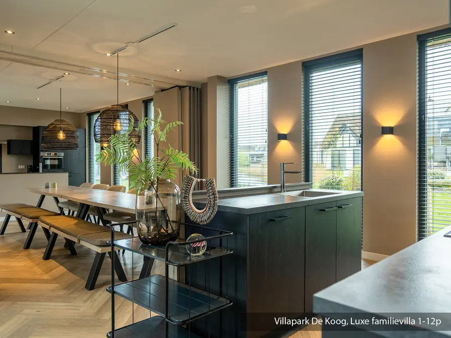 Deze 12-persoons villa bestaat uit twee geschakelde 6 persoons villa’s. Via de hal kom je in de enorme woonkamer met dubbele zithoek, 2 eethoeken en 2 grote smart-tv’s. Twee open keukens met elk een 4-pits kookplaat, afwasmachine en koffiezetapparaat. Twee slaapkamers met elk 2 eenpersoons bedden en een eigen badkamer met douche, wastafel en wc. Apart derde en vierde toilet. Op de eerste verdieping zijn vier slaapkamers met elk twee eenpersoons bedden, twee badkamers met douche, wastafel en wc. Daarnaast zijn er nog twee badkamers met elk een ligbad, wastafel, wc en twee privésauna’s. Er is een ruimte met wasmachine en droger. Vanuit de woonkamer via de grote glazen schuifpuien heb je toegang tot een heerlijk dubbel terras met tuinmeubels en acht ligstoelen.