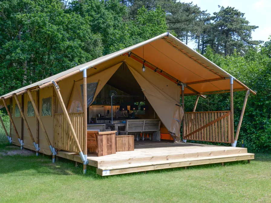 De leefruimte van deze ingericht tent bestaat uit een zithoek met tv en een eethoek. De open keuken is ingericht met een spoelbak voorzien van stromend koud en warm water en een koelkast. Er zijn drie knusse slaapruimtes, waaronder een bedstee voor kinderen. Je kunt gebruik maken van het sanitair paviljoen op het park. De ingerichte tent heeft een terras onder de overkapping.