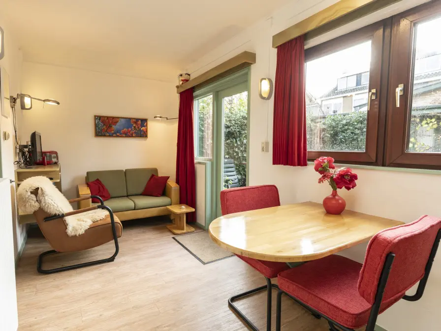 De woonkamer heeft een zithoek met tv, een eethoek en magnetron. Het keukentje is ingericht met koelkast en gasfornuis, Quooker, filterkoffie-, Senseo en Nespresso apparaat, verder zijn er een contactgrill, broodrooster en mixer aanwezig. In het gangetje is een tweepersoonsbedstee met tv. Er is een badkamer met douche en toilet. Dit vakantiehuisje heeft een omsloten achtertuintje.