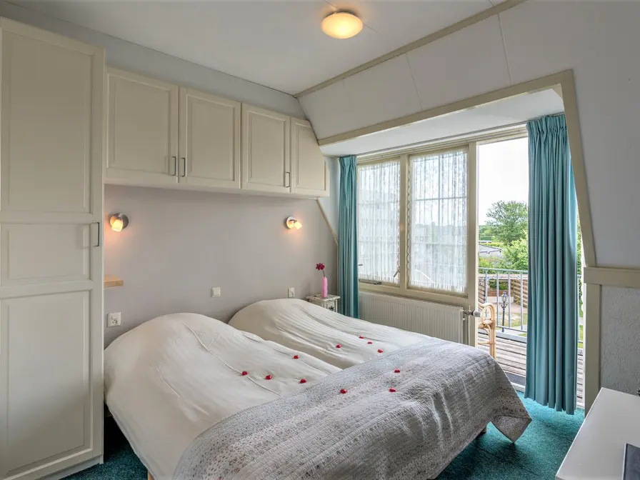 De kleine kamer met balkon heeft twee eenpersoons boxspringbedden, koelkastje en tv. In de badkamer is een douche, wastafel en toilet.
