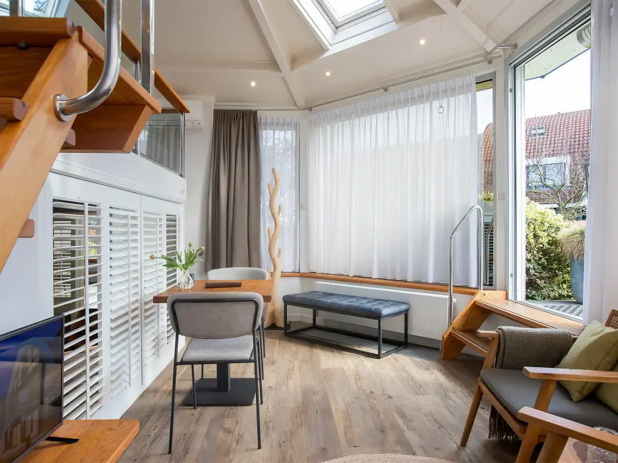 Midden in de hotel tuin staat, op een rustig plekje, de Superior Tuin Suite. De suite is opgebouwd uit drie lagen, een badkamer met ruim ligbad en aparte regendouche met sunshower. Op de etage vind je een lounge voor een knus samenzijn met thee en Nespresso faciliteiten. Vanuit de lounge kom je met een trappetje op de 2e verdieping met een kingsize bed met Texeler dekbed. Vanuit je bed heb je via het dakraam zicht op de sterrenhemel. Privé terras.