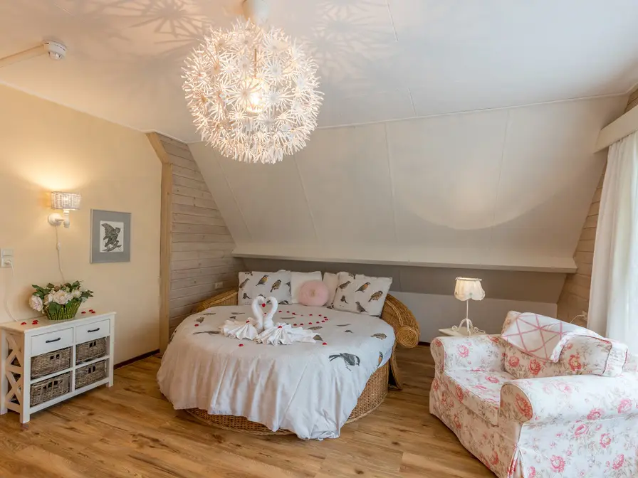 De ruime kamer heeft een rond bed en een zitje met flatscreen, tv en wekkerradio. Een minibar is aanwezig. De badkamer heeft een bad met whirlpool en separate douche en toilet. De kamer heeft een terras.