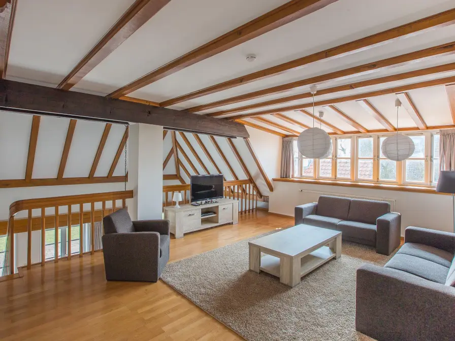Op de begane grond van appartement W is de woonkamer met zit- en eethoek. De open keuken is ingericht met een gasfornuis met oven, magnetron, koelkast, vriezer en vaatwasser. Er is een toilet aanwezig. Op de bovenverdieping is een vide met een ruime zithoek, voorzien van flatscreen-tv en dvd-speler. Er zijn drie slaapkamers met ieder 2 eenpersoons boxspringbedden. De twee badkamers hebben een douche en wastafel. Een van de badkamers heeft een toilet. Dit appartement heeft een terras op het zuidwesten. Tuinmeubilair is aanwezig.