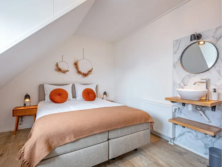 Op de benedenverdieping is de badkamer, met toilet, inloopdouche en handdoekradiator. Vanuit de hal bereik je de bovenverdieping met twee slaapkamers. De grote slaapkamer heeft een tweepersoonsbed met twee eenpersoonsdekbedden, een kast en wastafel. De tweede slaapkamer heeft twee eenpersoonsbedden, een kast en een wastafel. Bij aankomst zijn de bedden voor jullie opgemaakt.